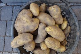 Fangen wir mal mit den positiven Eigenschaften an: sie ist auf jeden Fall eine absolut festkochende Sorte, auch schon direkt nach der Ernte. Diese Eigenschaft hat in dieser Form bisher nur die Sorte Belana gehabt. Jetzt gibt es da etwas Konkurrenz. Das Wachstum am Feld war zunächst etwas verhalten, aber dann hat die Golsdmarie den Turbo eingeschaltet und ein saftig, dunkelgrünes und dichtes Kraut gebildet, was den anderen Sorten in nichts nachsteht. Im Gegenteil: Jede einzelne Mutterknolle hat sehr viele Triebe gebildet, so dass man schon früh auf eine gute bis sehr gute Ernte-Menge hoffen konnte. Das bestätigt sich nach der erste Rodung auch: es hängen viele Knollen an einem Stock dran - und auch ausreichend große Knollen.