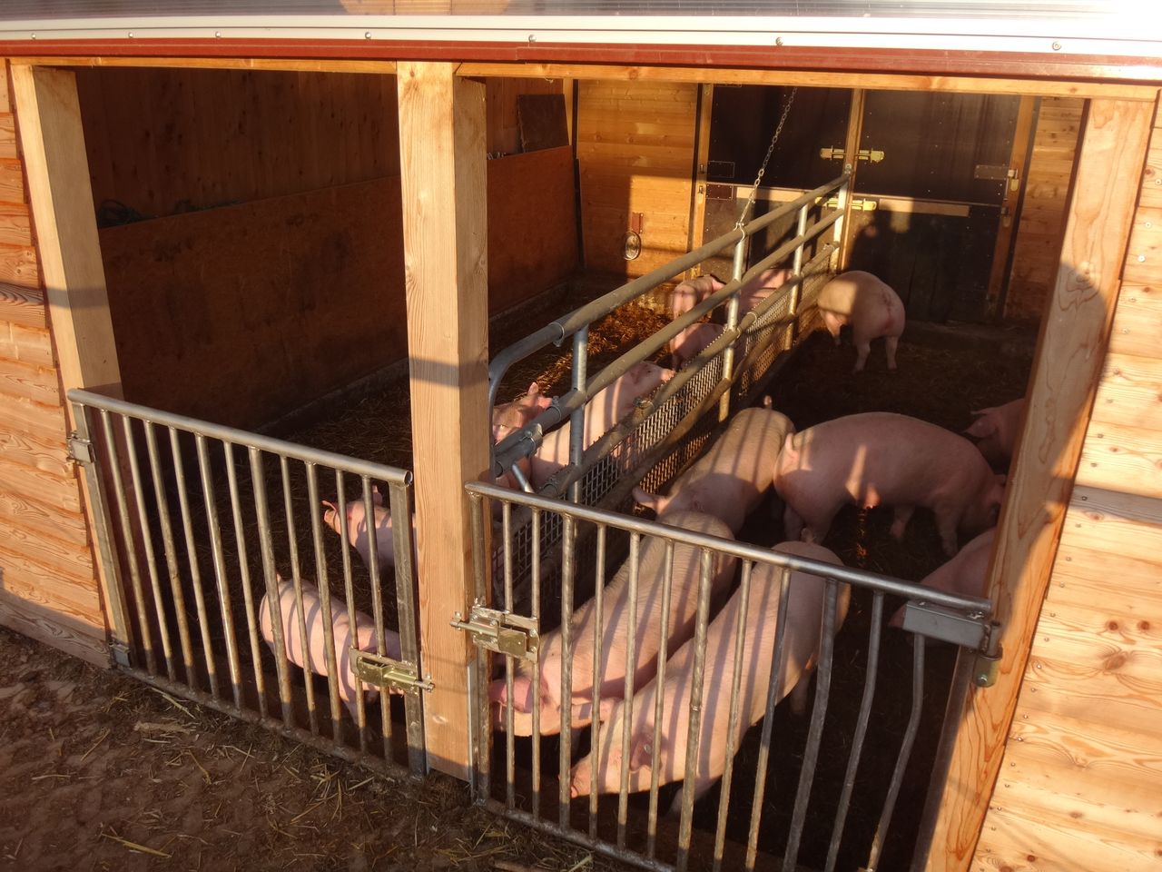 Aber bei uns sind die Schweine schon etwas mehr als "umher laufende Schnitzel". Solange wir Menschen überwiegend Fleischesser sind, sollten wir alle Tiere ordentlich behandeln. Oft fällt dann der Begriff „artgerechte Haltung“, aber ehrlich gesagt: für eine Schwein wäre eine wirklich artgerechte Haltung, in Freiheit durch Wald und Wiese zu streifen und nach Eicheln und Früchten im Boden zu wühlen. Ganz so gut haben es unsere Schweine dann doch nicht. Aber schaut euch die Bilder an oder kommt einfach vorbei. Unsere Schweine können im Stroh wühlen, in der Sonne dösen, Verfolgungsjagden veranstalten (was sie sehr gerne machen …), sich bei 30 Grad ist den Schatten legen, bei minus 10 Grad sich im Stroh verkriechen, bei Regen und Sturm die Tropfen auf der Schnauze spüren, und und und. Und vor allem: sie haben frische Luft, frisches Futter (auch mal Gras, Kartoffeln, Äpfel, etc.) und soziale Kontakte zu anderen Schweinen und Tieren. Dass es bei uns keine Gülle-Kanäle gibt, versteht sich von selbst, oder? Schaut es euch an.